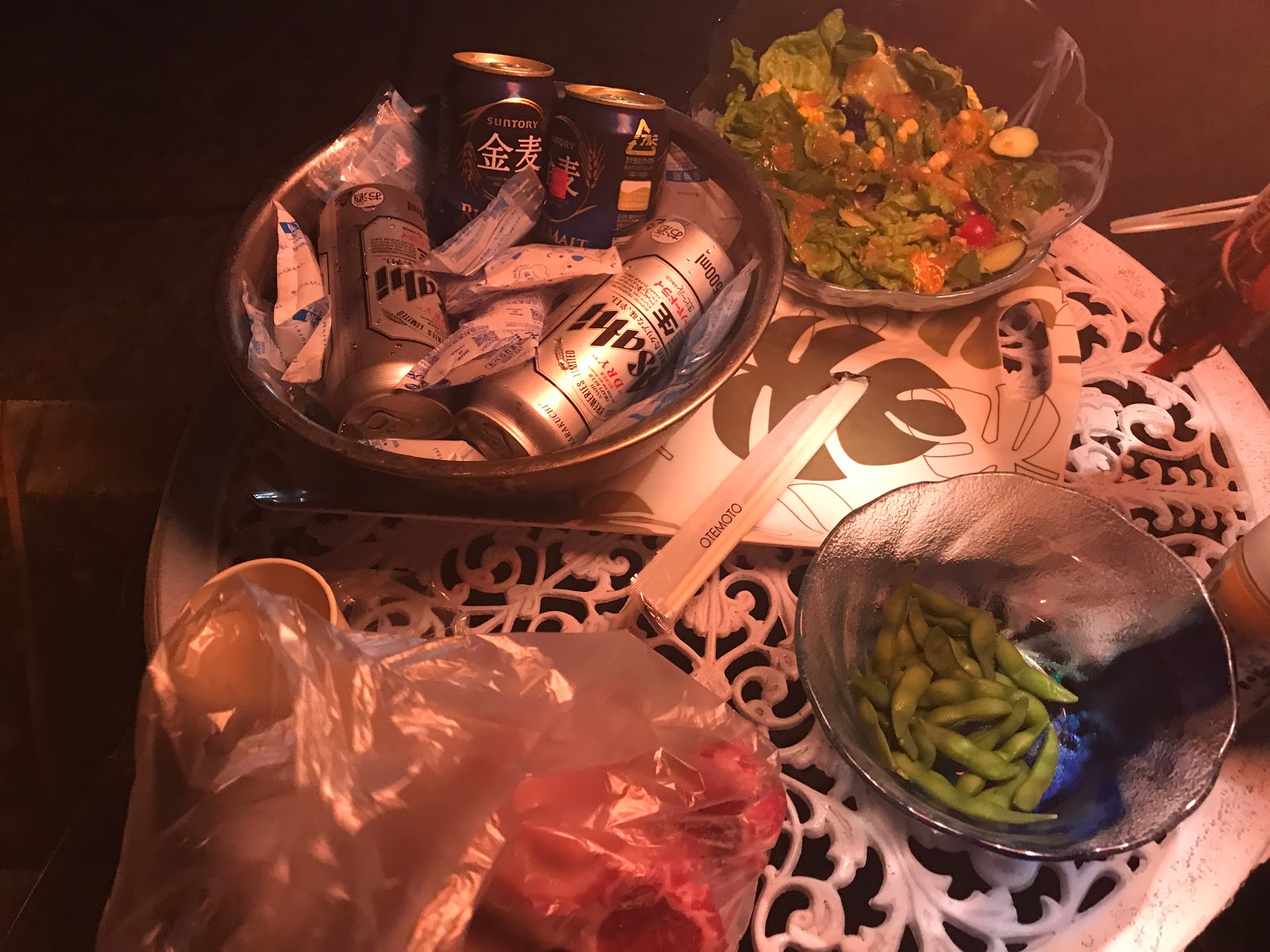 先月から社のミーティングを定期的に始めようということで昨夜は会議を開きまして20時過ぎたのでそのまま泊まることにし、昼間の暑熱の残る屋上で飲みました。急に思い立っていきなりビアガーデンのできるこの身の幸せ、色々大変だけどいいこともありますわね。