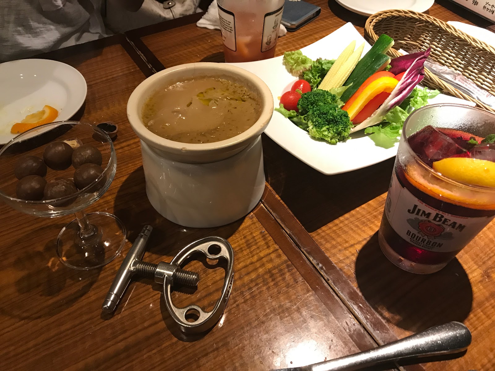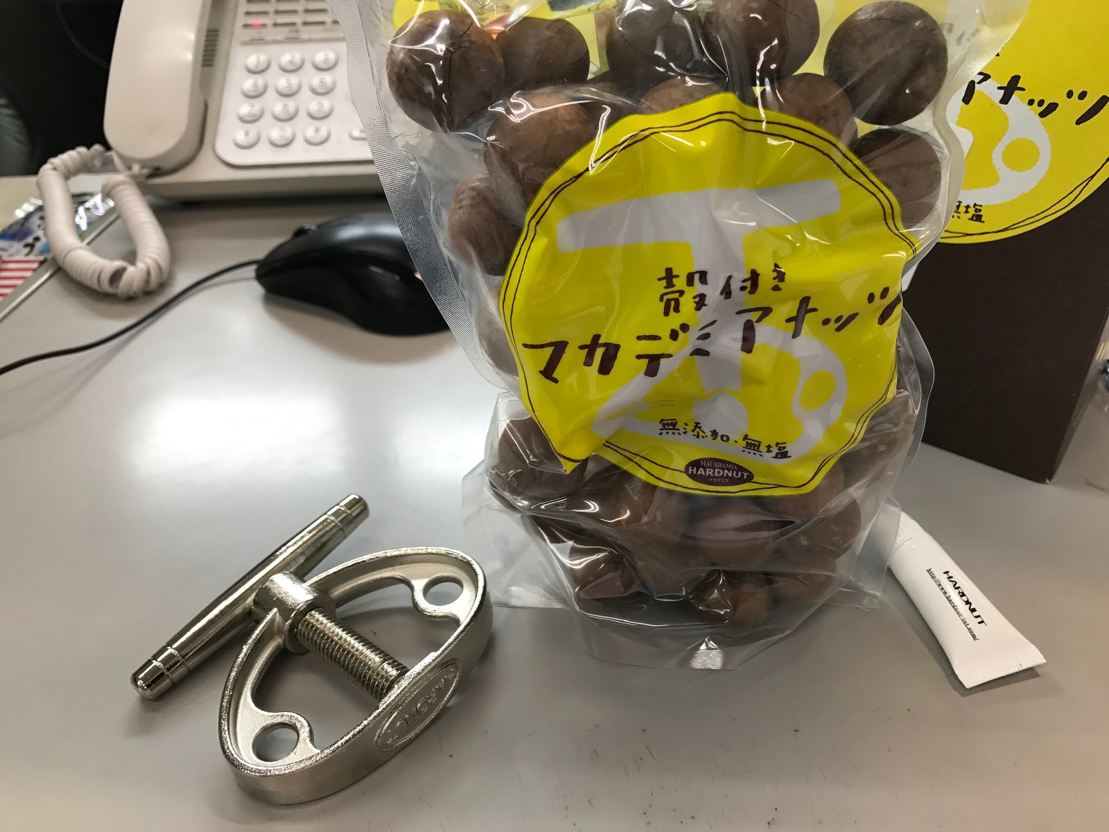 先日の日記に書きましたが池袋のイタリアンで飲んだ際お通しに出されたのが殻付きのマカダミアナッツでして、万力状の割る器具と一緒に出てきました。店員さんの説明に従いヘソと呼ばれる部分にねじ先を当てて回すとバチンっ!と大きな音と共に殻が割れまして、ハワイ土産のチョコ以外で初めて食べたけど実がとても美味しいのに加えきれいに割るのにコツがいったりしてなかなか間が持つんであります。