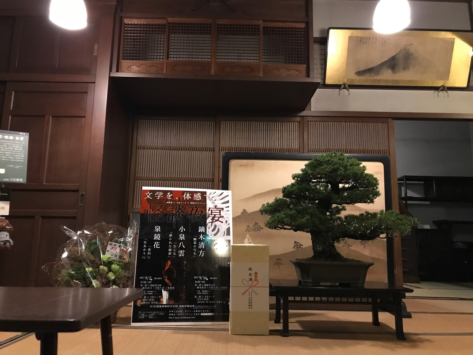 日も落ちて豪邸ならではの隅々に闇が作り出す、どこか空恐ろし気な空気が満ちるころ開演となりました。コントラバス一本がおどろおどろしい音響を奏でる中演者が語るのは、鏑木清方「幽霊の写生」小泉八雲「むじな 葬られた秘密」泉鏡花「夜釣」という一流どころ。