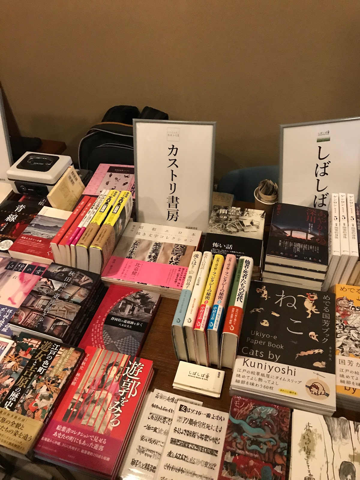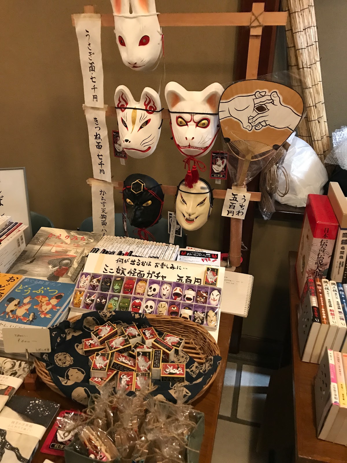 さて茶室を改造したホールが会場でございまして、客席の横には同好の士によるミニミニショップが置かれておりA元さんによるお面店や、ものすごくマニアックな書店などもお店を広げておられました。あ!いば師匠の好きなあのお店も!