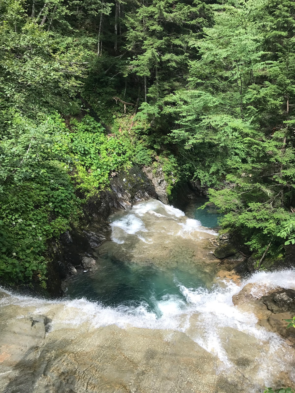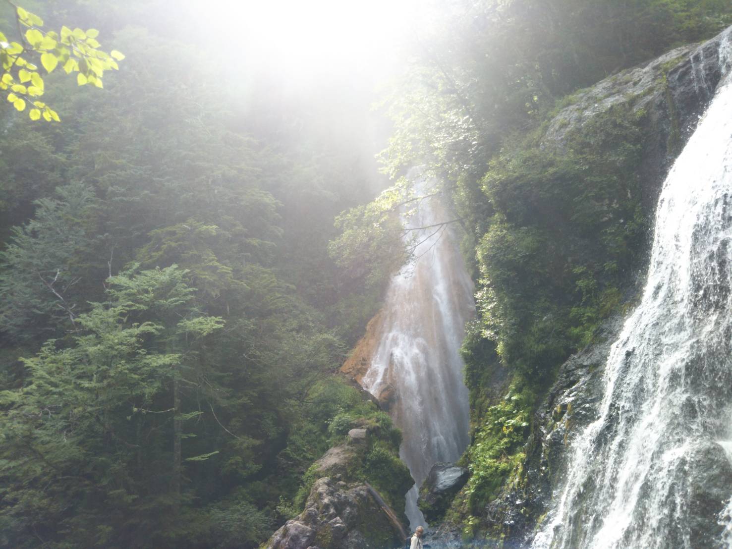 夏場の交通制限で一般車が止められているどん突きの駐車場から20分ほど山の奥へ歩いたところにひっそりと落ちている滝は、三つの流れがそれぞれに作る秘瀑でありました。