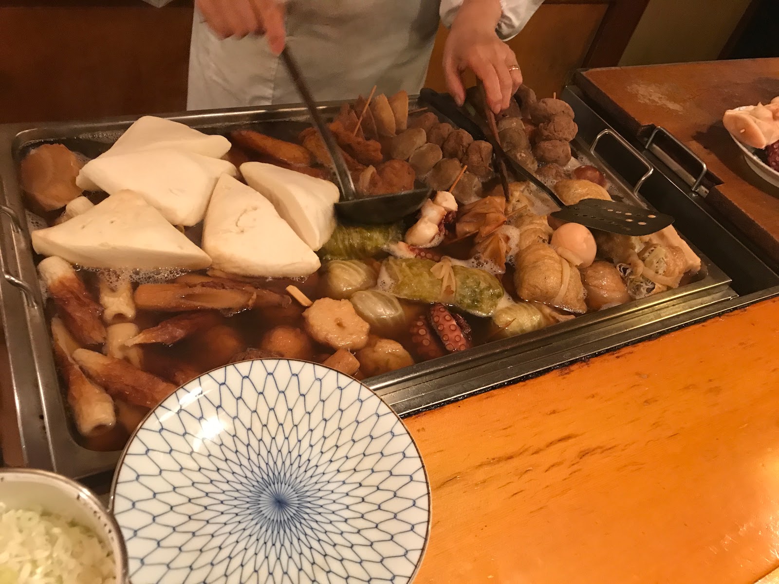 予約ができないところにどうしても席を取ろうというので、早々五時台に集合して入りましたらまんまとおでん鍋正面近くのベストポジションに座ることができました。