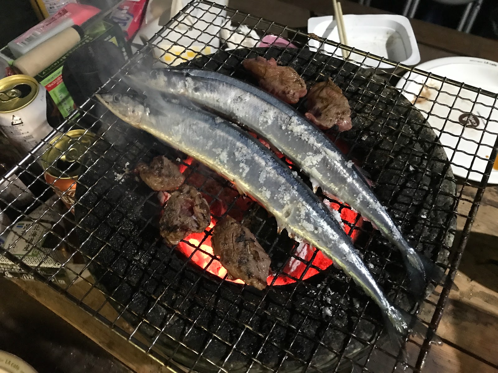 日の落ちる前にさとうみファームに到着。持参したお肉とみうらで買った生サンマなど焼きつつ盟友と語りました。