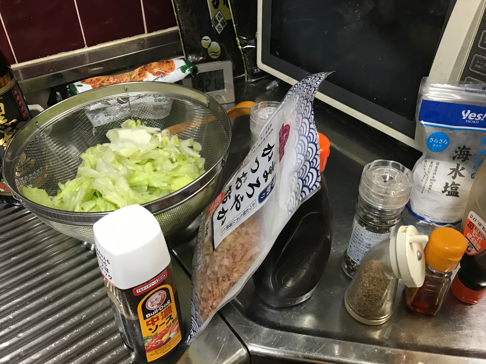 しかしあたくし翌日飲み会で泊まりのため東北で仕入れてきたホタテとタコを早めに消費するため、ここは豪華版海鮮焼きそばにしてしまおうと全部ぶちこむ事にいたしました。その他の具材も全て残り物。