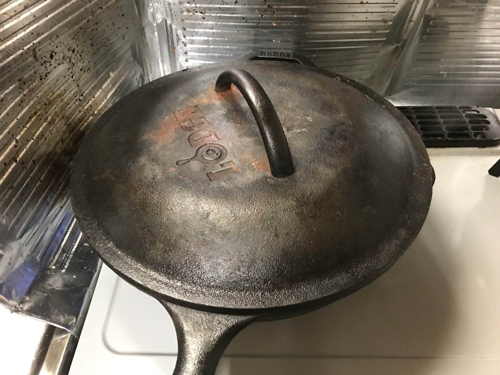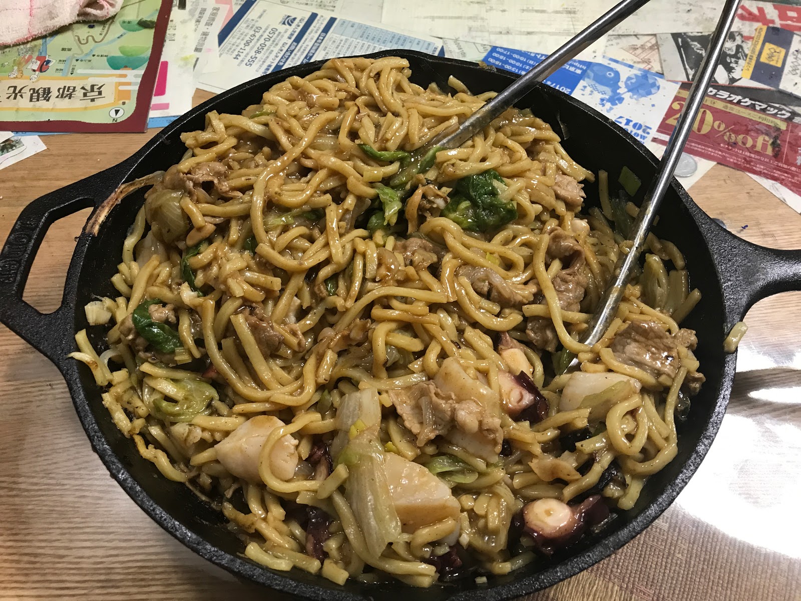 スキレットで豚小間とホタテの肝を炒め、一旦取り出して玉ねぎを。そこに麺を入れ蓋をして蒸しにかかります。量が多いのも特徴というだけあり2玉で一杯、水分は先日手羽先を煮だして作ったコラーゲンスープ。