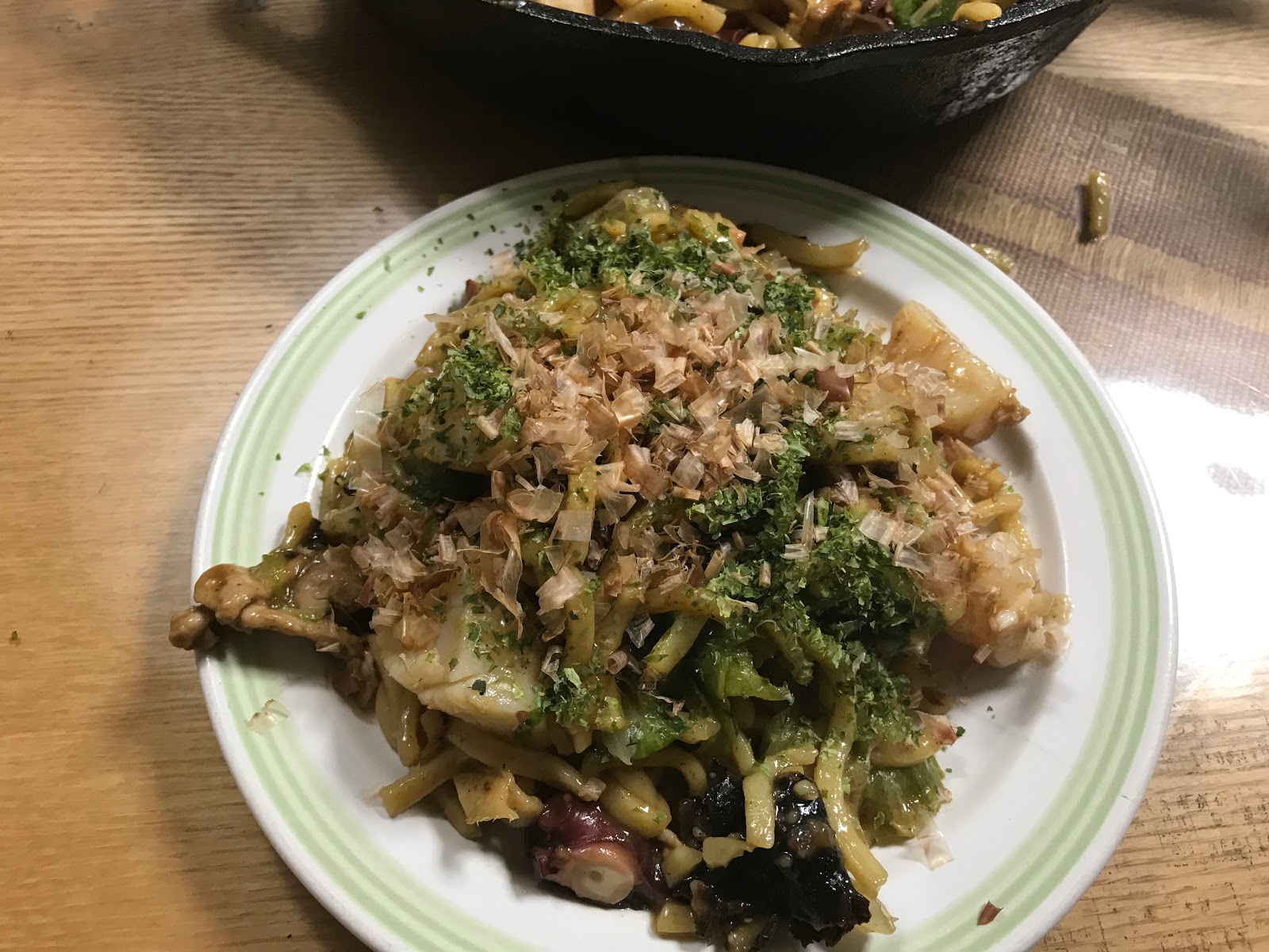 しかしあたくし翌日飲み会で泊まりのため東北で仕入れてきたホタテとタコを早めに消費するため、ここは豪華版海鮮焼きそばにしてしまおうと全部ぶちこむ事にいたしました。その他の具材も全て残り物。