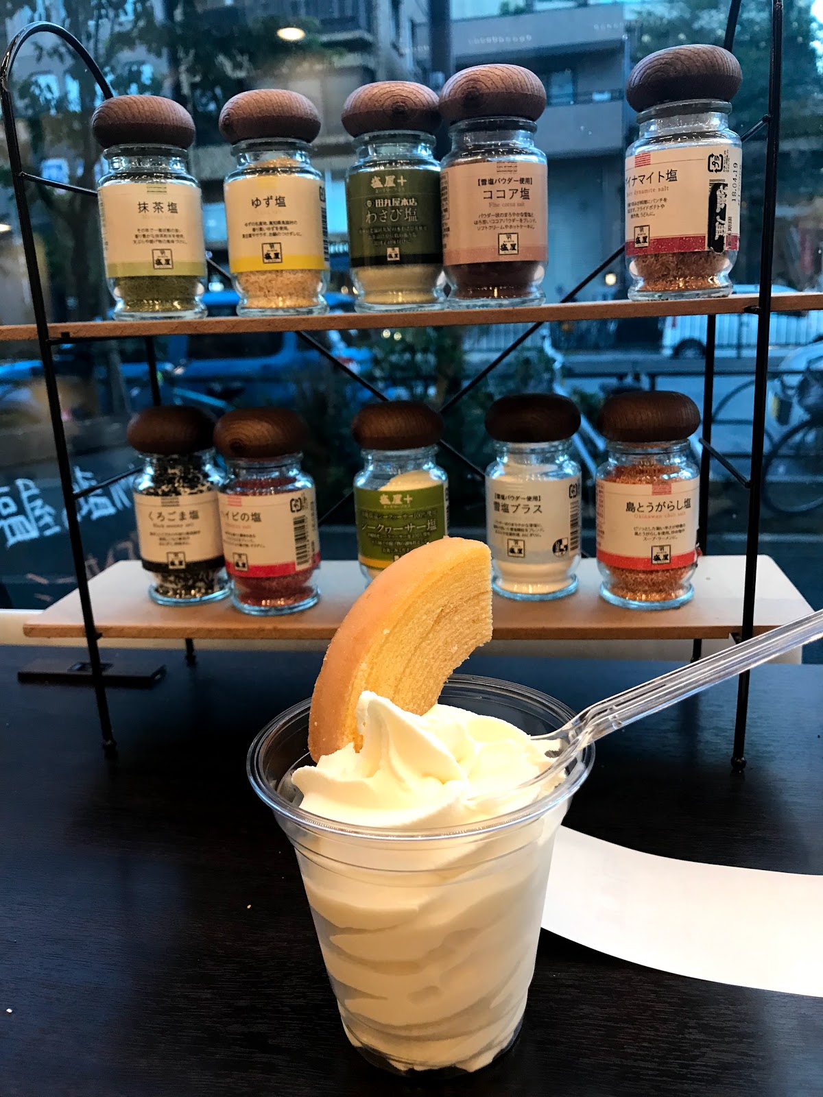 麻布十番に戻り本日の真の目的を待つ間塩屋さんで塩ソフトいただきました。いろんなお塩をかけて楽しめます。