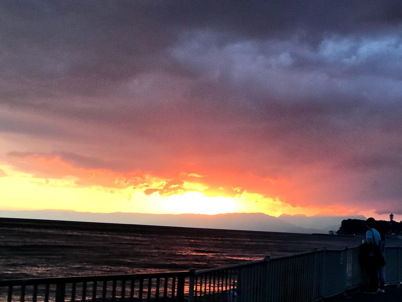 蒸し牡蠣いただきつつクラフト工房でお茶々の帽子作ったり、知り合いの方からご注文いただいたニット帽仕入れたりと小一時間ほど楽しみました。四時過ぎて撤収するさとうみの面々にお別れし湘南海岸に出ますと、どんぴしゃりのタイミングで夕日が落ちるところでありました。やっぱり持ってるね僕等!等ってなにさ?