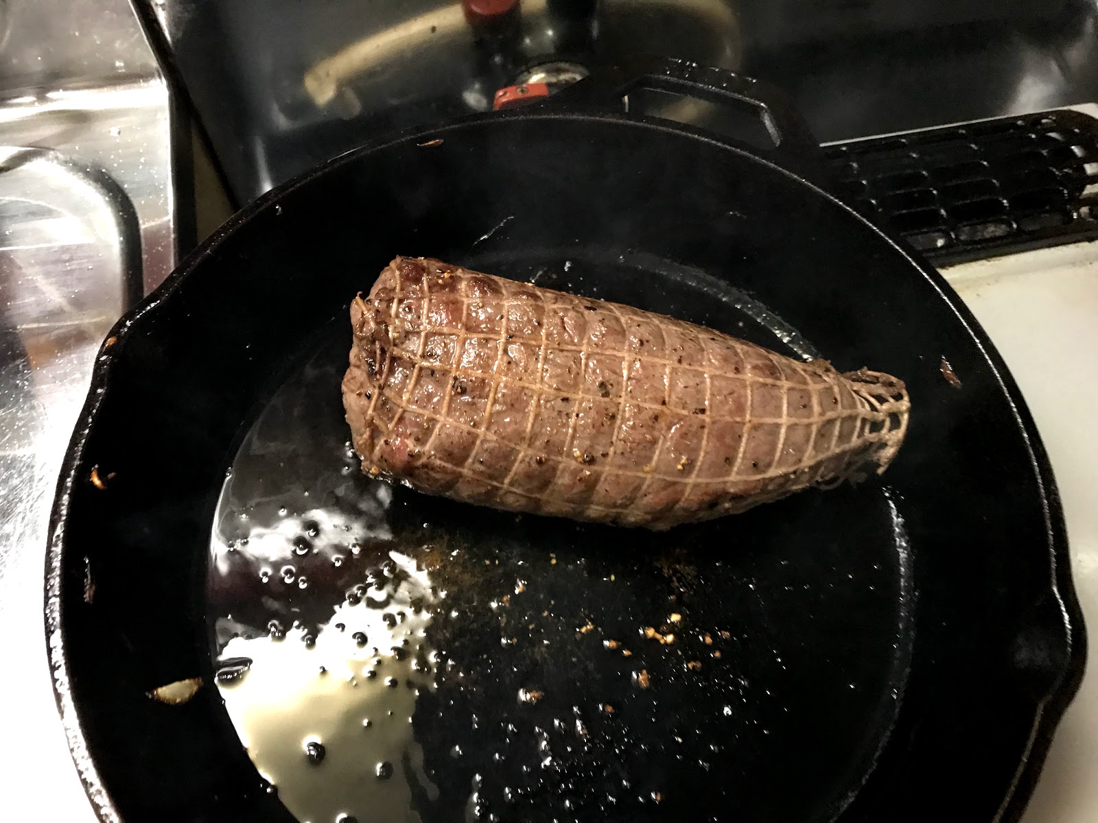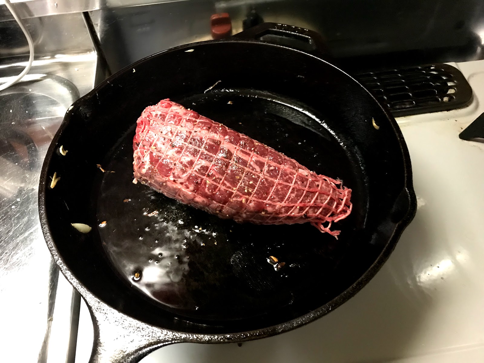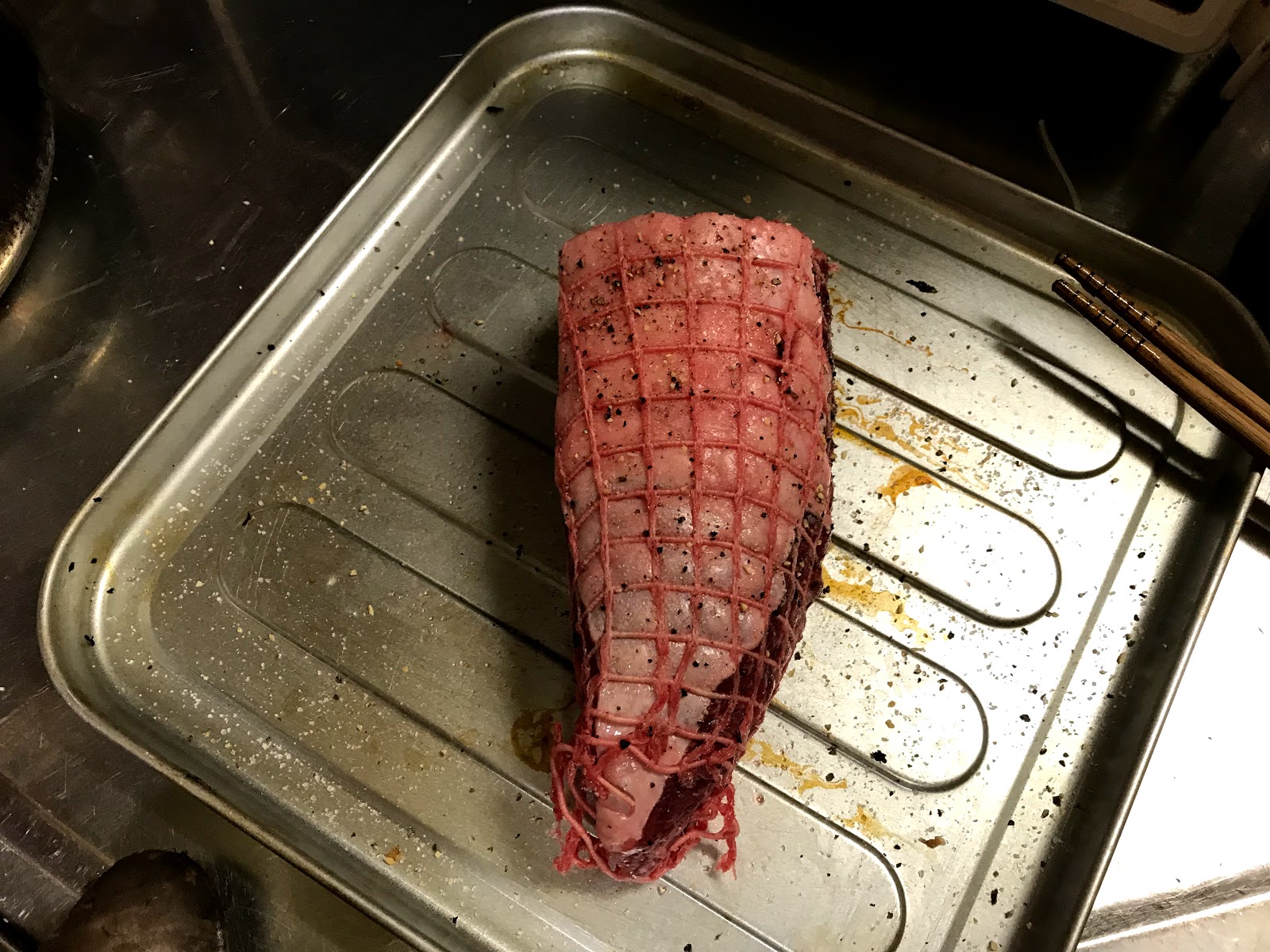 クリスマスも近いという事で直売会で売るローストビーフ用の肉を考えていて、オーソドックスな国産もも肉の他にもう少し脂があってそれっぽいものとして先日開発?したUSミスジスはどうかと。ただしステーキカットで焼いた場合は火が通るのですが、ローストビーフは中心まで火を入れないため真ん中のスジが柔らかくなるかどうかが問題なんです。