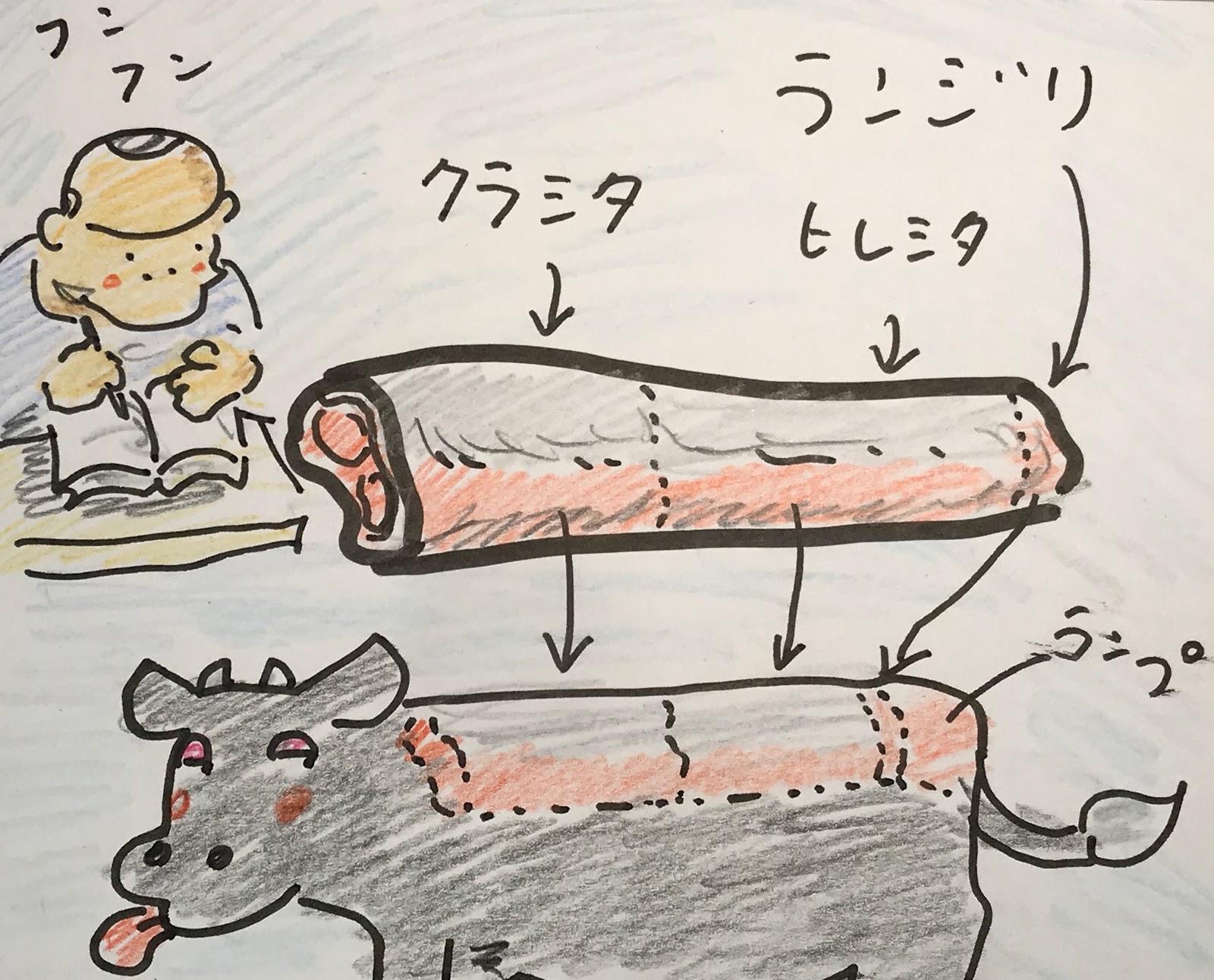 ところでお肉には部位の他にも部分的な呼び名がありまして、例えばロースならクラシタとヒレシタなんて。これは馬の鞍を置く部分とヒレのついてる部分という意味です。