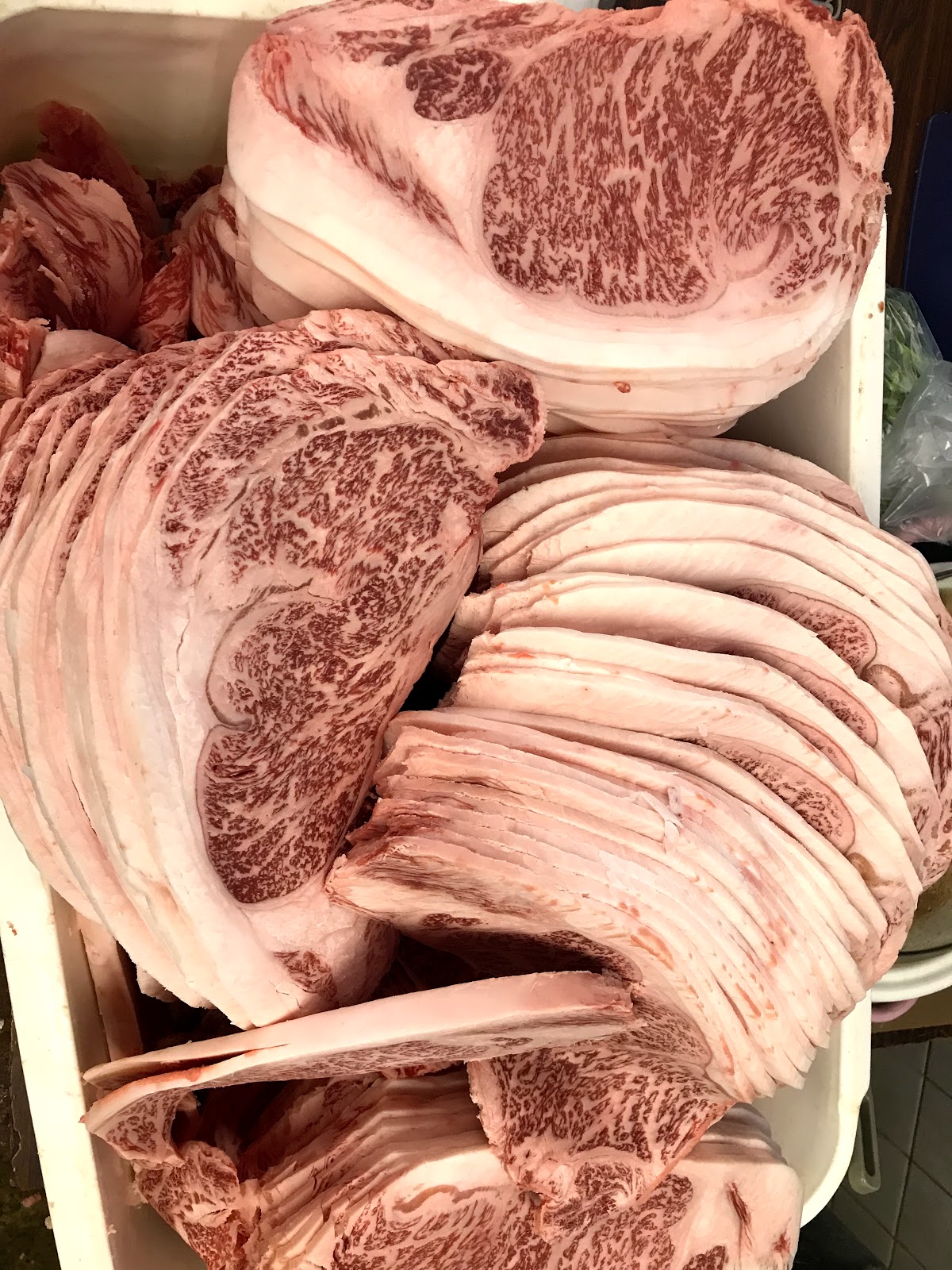 終盤に来て毎日のように和牛スライスしておりますと、普段なら「高いんだから丁寧に仕事しろ」とか言ってるものが大量に目の前を通り過ぎていくので、おまけに疲れがたまって朦朧としてくるのでだんだん一枚いくら?とか感じなくなってまいります。