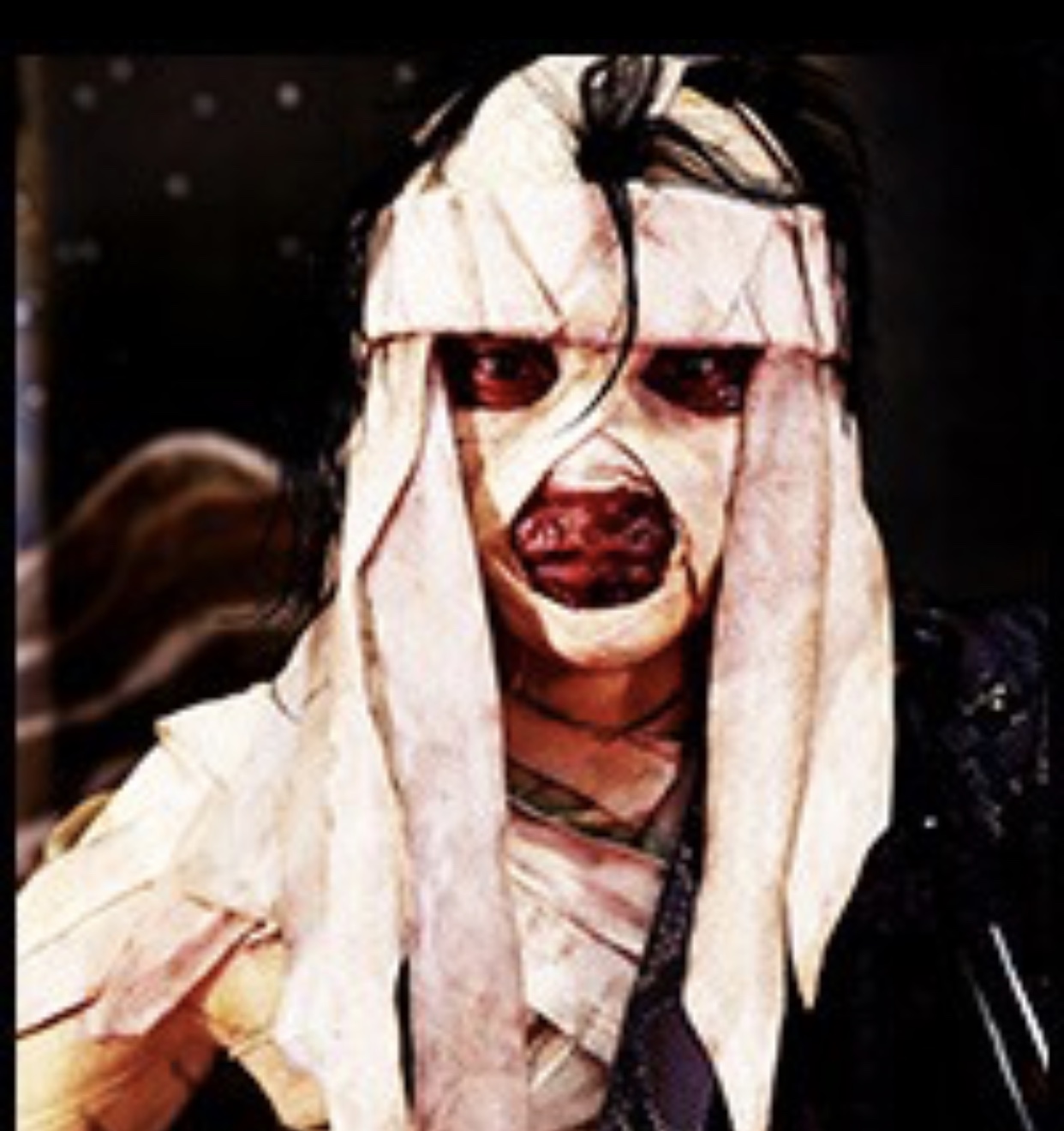 鏡に映った己が姿、どっかで見たようなと思ったら映画「るろうに剣心」に出てきた包帯だらけの姿の男のようだと。検索したら志々雄真実というキャラだそうで。