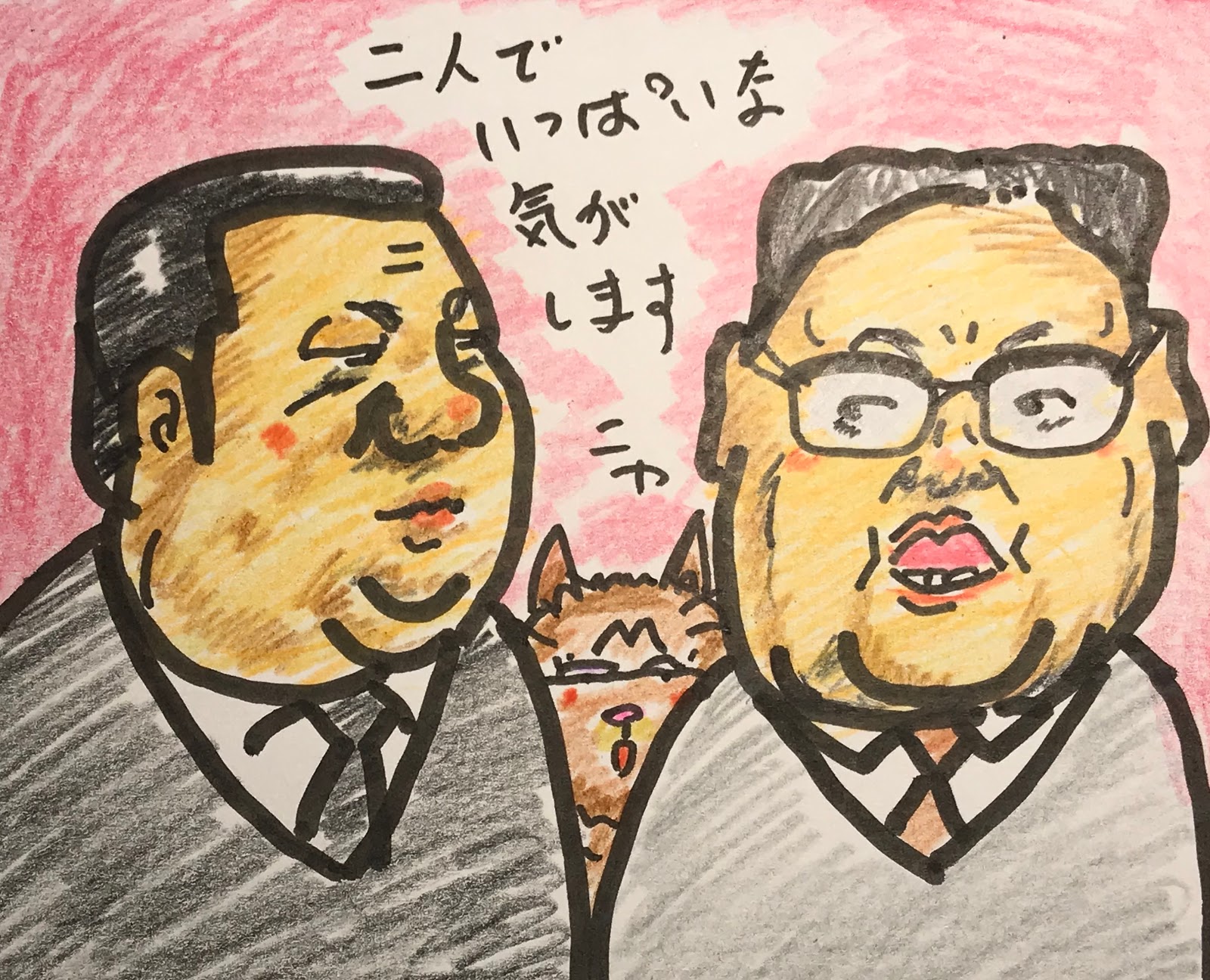 お絵描き 2018年03月27日 一触即発って感じだったお隣あたりもこのところは少し落ち着いたんでしょうか。王朝三代目の人が、最近ものすごく偉くなっちゃった人のところを訪ねてるような?今時衛星写真でも写っちゃいそうな話でも、やっぱりはっきり分かんないんですね。特別列車と戒厳令の街、怪しいなあ~ (*_*; そりゃいいんですが二人ともスペースとりそうですからね、よっぽど広い会見場でないと・・・ «前 次» スタッフブログ