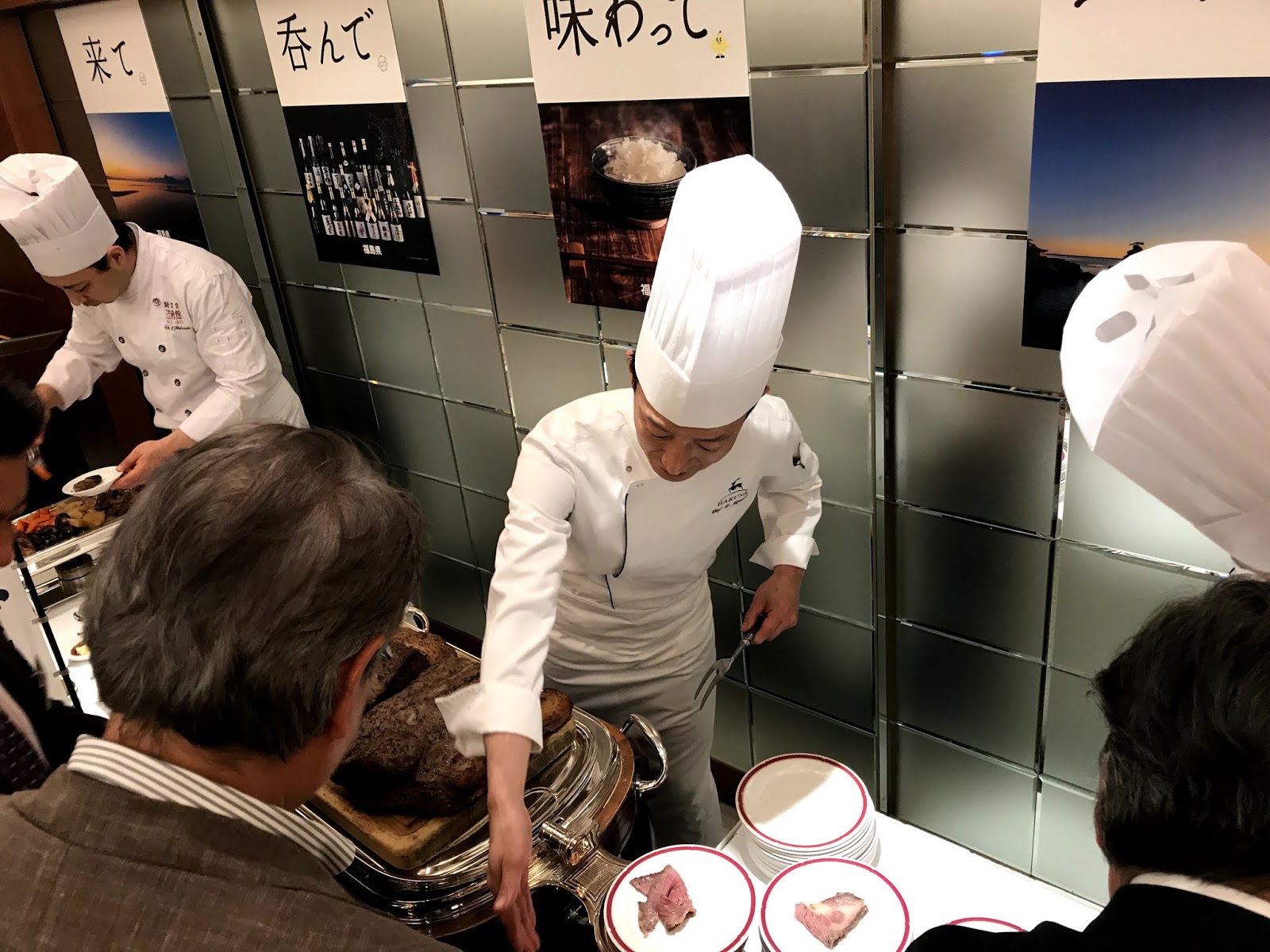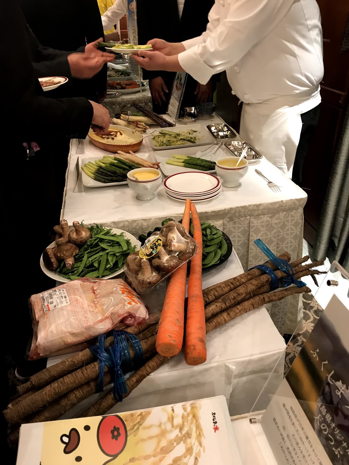 パーティールーム一杯に人が集まる大盛況の中、会館のシェフさんが腕を振るった様々な物産をいただきました。