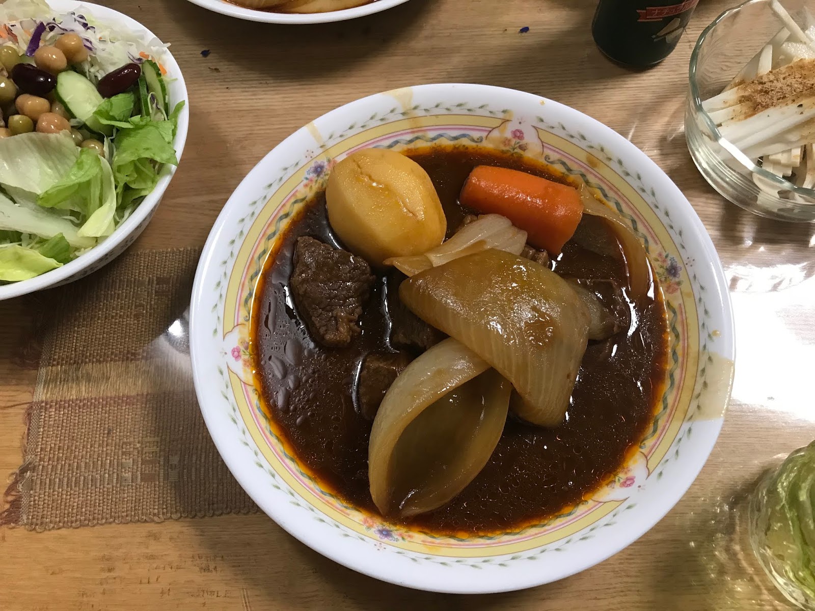 これで飴色玉ねぎ炒めてる間に塩コショウで下味付けた肉に焼き入れて、野菜も炒めて、それを投入してソースの材料入れてタイマーセット。