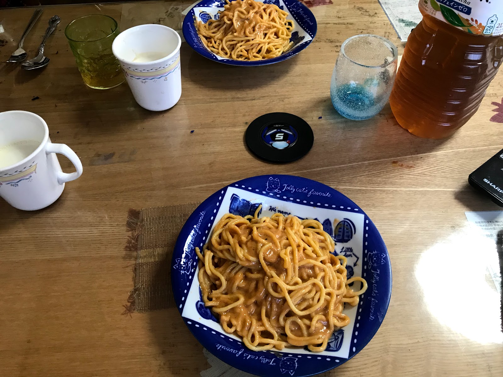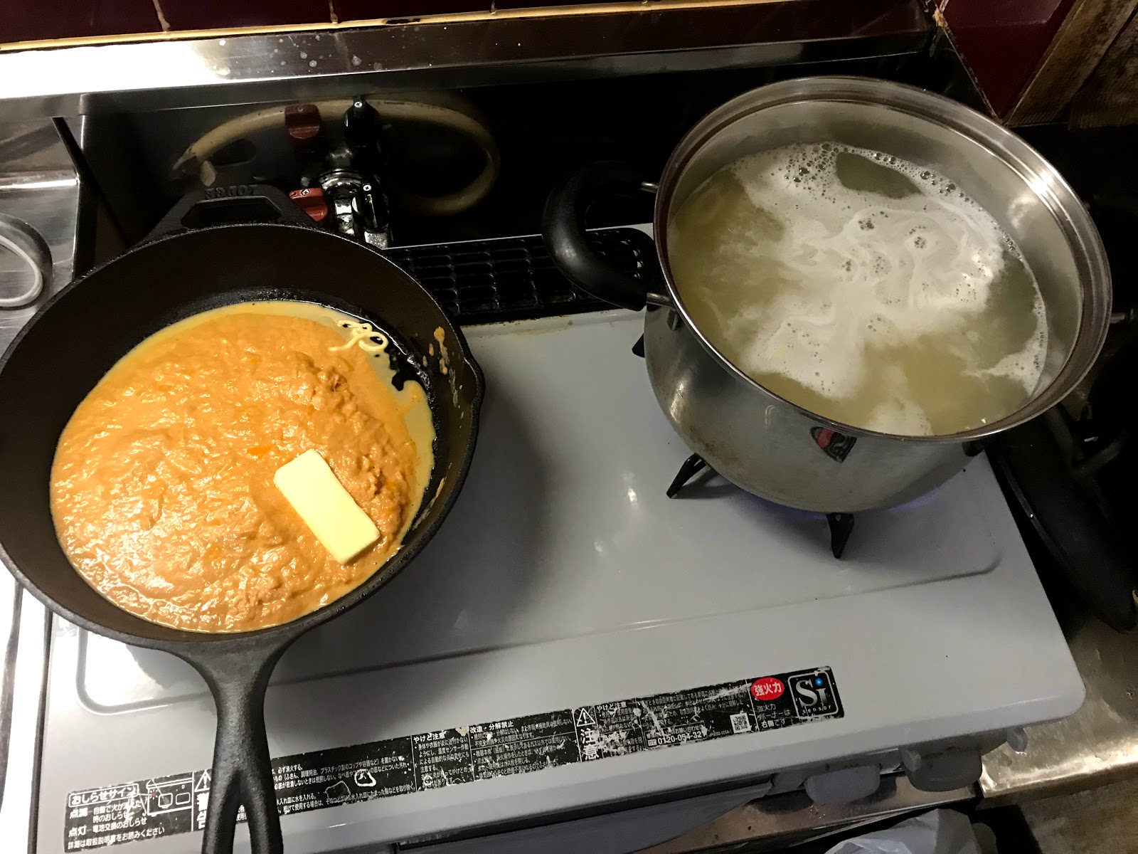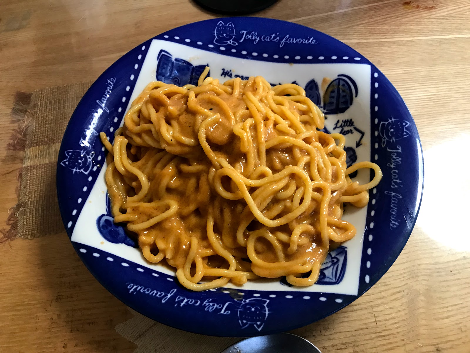 ソースまで手が回らないので今回はレトルトのカニクリームソース。麺茹でるのと同時並行で。