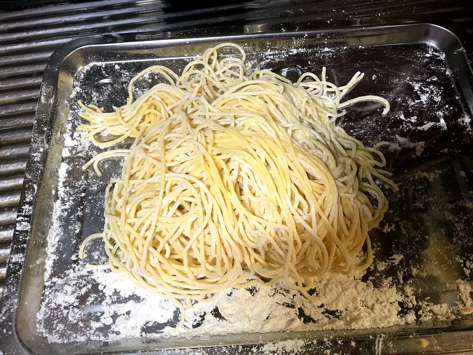 いろいろな麺を打った中で特に既製品との違いを感じるのがこのパスタなんでして、乾麺のポキポキした食感ではないもちもち感がいいんであります。
