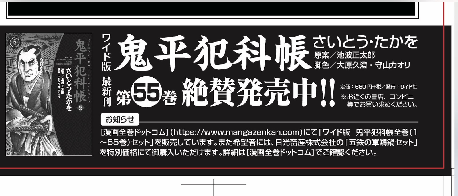 あたくしが作った鬼平犯科帳五鉄のしゃも鍋セットが編集者さんの目に留まり、さいとうたかお先生のコミック版連載25周年を記念して発売された全巻セットを買った方に特別価格で販売するという。