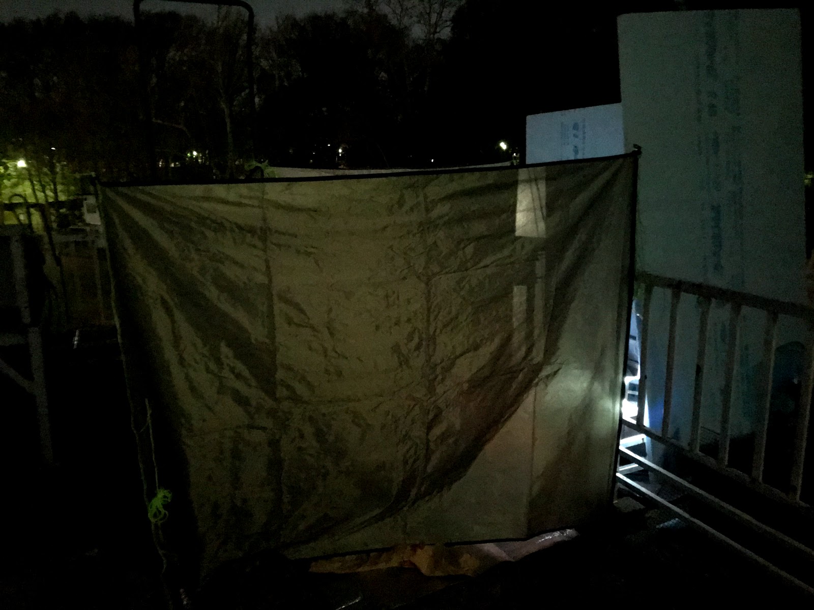 暗くてよく分かりませんがこれキャンプ用の陣幕でして、薪ストーブの後ろをスタイロフォーム、残りの三方をこいつで囲いますと空の開けた快適な空間が出現するわけです。