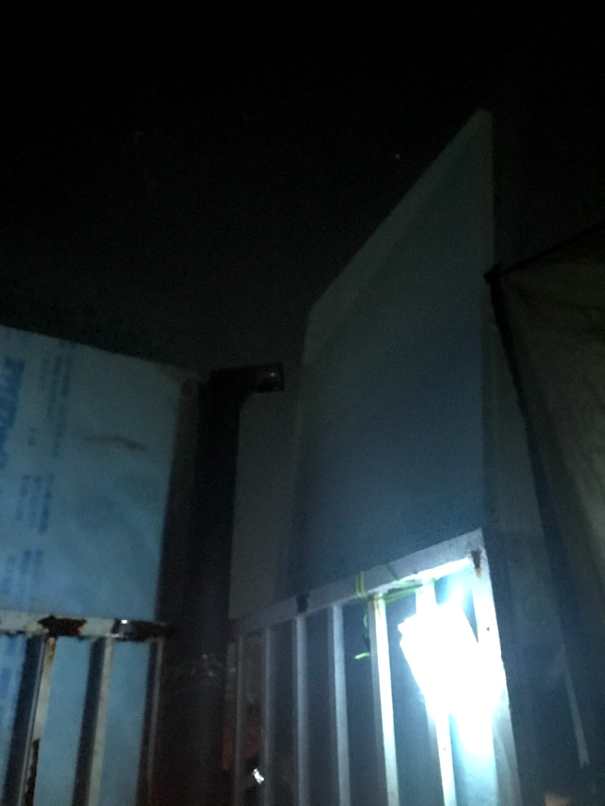 暗くてよく分かりませんがこれキャンプ用の陣幕でして、薪ストーブの後ろをスタイロフォーム、残りの三方をこいつで囲いますと空の開けた快適な空間が出現するわけです。
