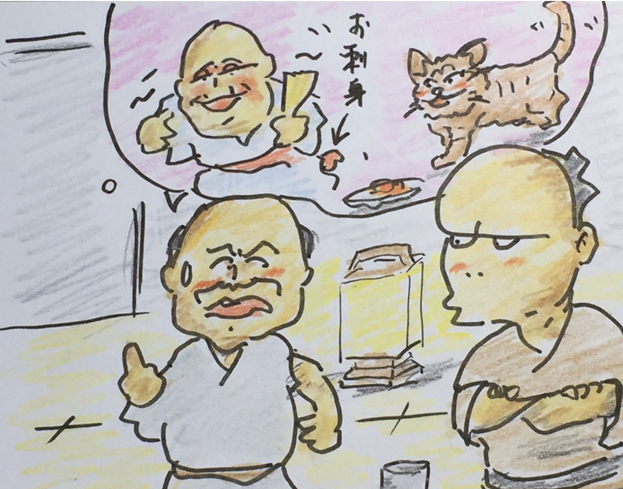 昨夜は出ませんでしたが、酔っぱらってかっぽれを踊ろうとして尻もちついた客のお尻に刺身がくっついてそこへ猫が飛びついたという牛太郎の話が笑わせます。