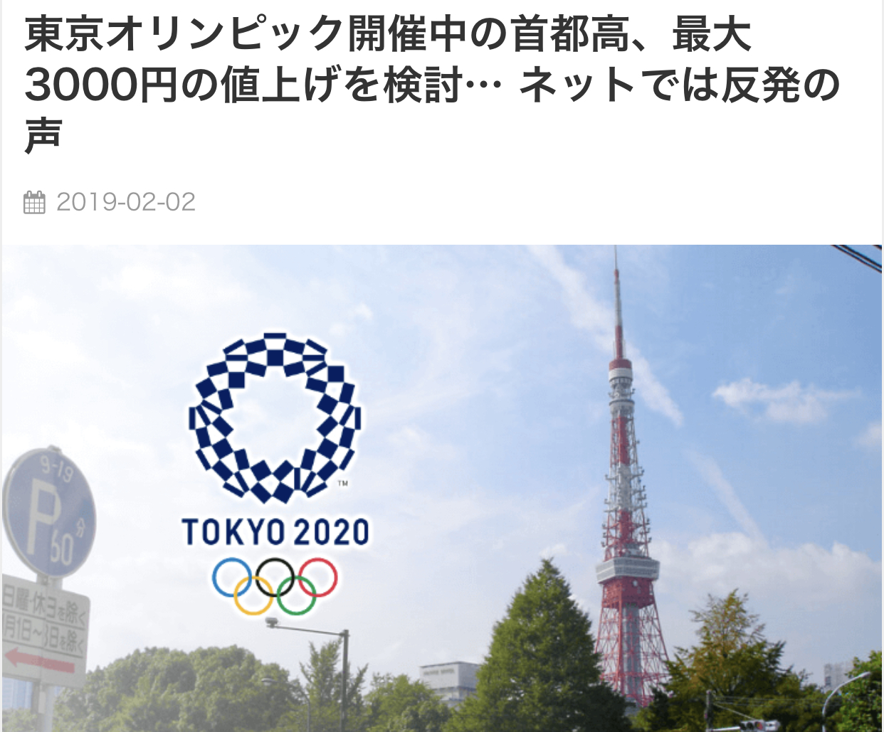 オリンピックの期間中渋滞緩和対策として首都高の値上げが検討されているという。